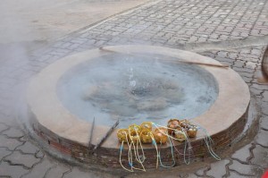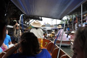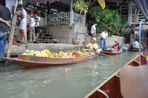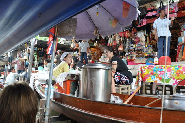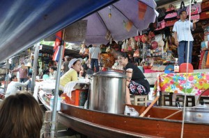 Our driver takes us to a small pier where we hire a mini version of a longtail boat to run us through the market and see the sights. Initially it looks like this may be a dud trip and prepare for disappointment because for the first 5 minutes or so we do not see any sort of boat or market activity, then we come alongside a couple of ‘shops’ that front onto the river, but see mostly the same old stuff we have seen everywhere else – Mrs. Columbus is giving me that ‘maybe we should just go back look’ when the boat turns a corner into what looks like complete chaos. There are boats everywhere, about half are filled with tourists taking in the spectacle, and the other half are filled with goods of all varieties imaginable – there are boats with fresh fruits all cut and cleaned and ready to eat, there are boats with fresh flowers, boats with meat, boats with beverages, and even boats with propane burners and woks making fresh fried dishes.