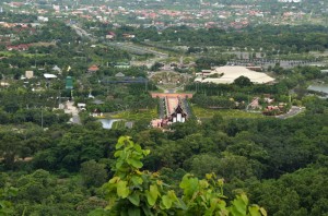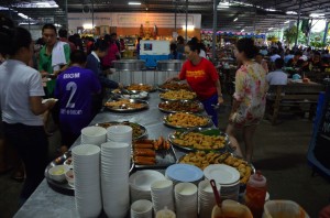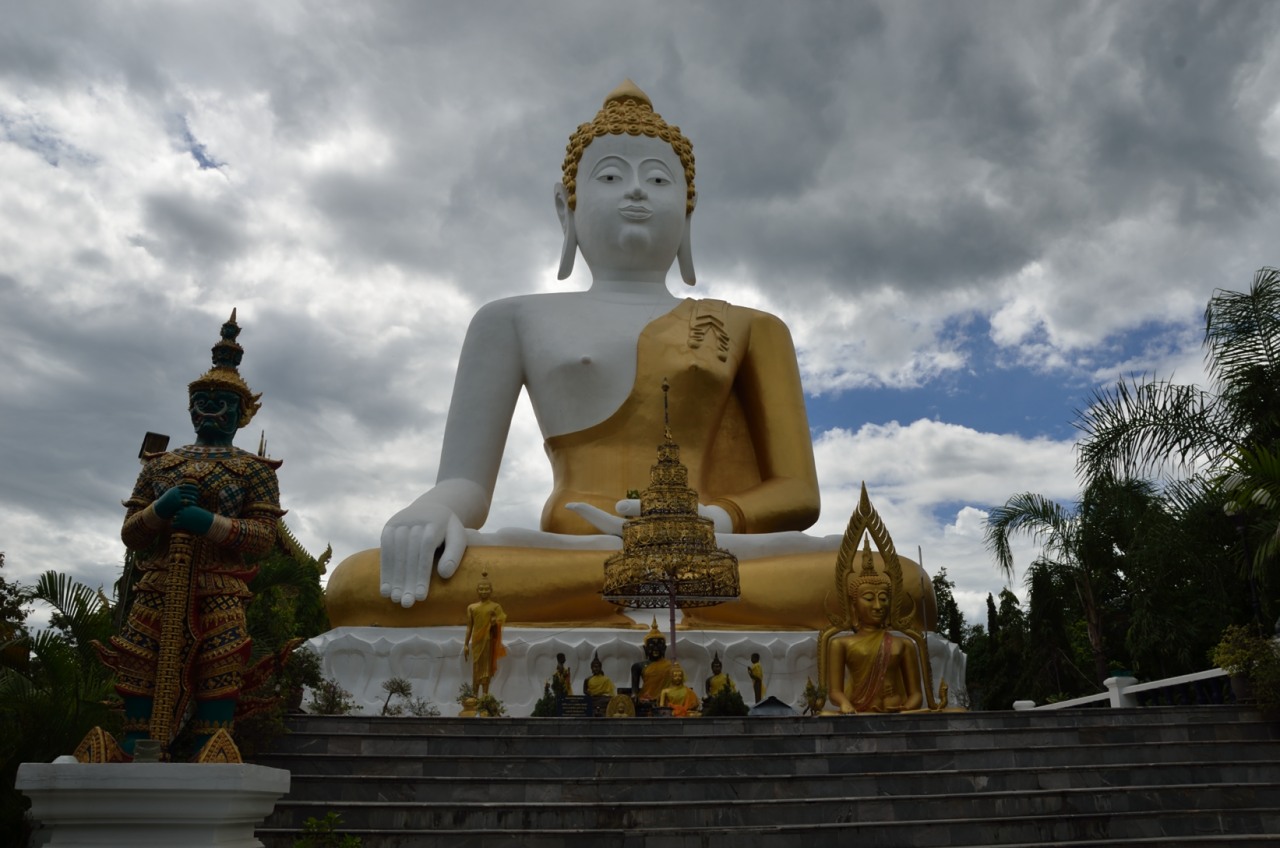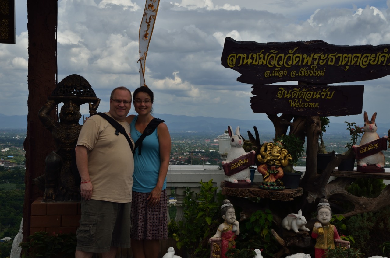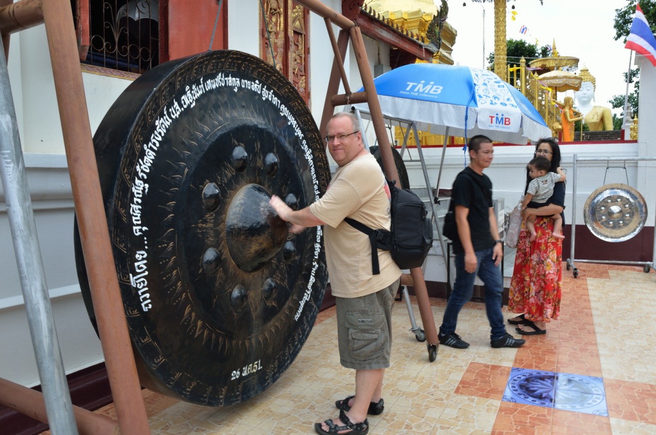 Our last stop for the day is at Wat Doi Kham, sometimes galled the Temple of the Golden Mountain. This temple is also outside of the city and not on the regular tourist track. In fact Riam has also never been to this temple, so two new temples in one day seems like a win for all of us!! One of the striking features of Wat Doi Kham is the large white buddha statue on the grounds. From some parts of the city you can see the buddha sitting up on the hill but you have to be looking for it, and it certainly does not get the attention that the more well know Wat Doi Suthep gets. Once again this is good for us, as we are a few of the less than 2 dozen people here, so it seems like we almost have the place to ourselves. The temple is built part way up the mountain and there is a big terrace that looks out over the city. The veiw seems a little more intimate with the city than the view from Wat Doi Suthep and we are glad we made the trek up here to see it. It will join the others on our list of recommended places to see, but we may keep that list in low circulation as these spots will be best enjoyed if they are not overrun by tourists – ironic isn’t it. Another big thanks to Ian who told us about most of these spots – we would not likely have discovered them otherwise.