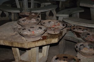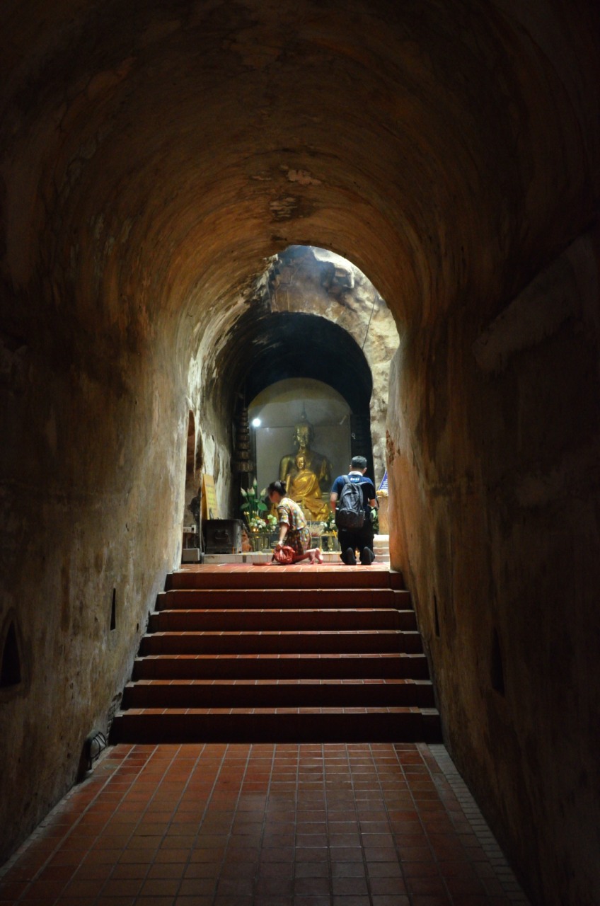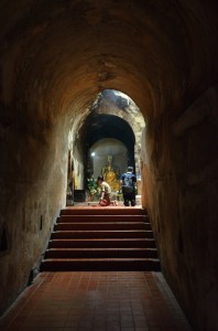 Most of the temples in the city are built on a regular type city lot – they are often surrounded by a wall and might have a few trees, but are generally quite sparse on the landscaping. Wat Umong is completely built in the forest and we can see why this would be quite a change from the rest of the city temples. The day that we are there they are having a ceremony to induct new monks. In the Thai buddhist culture there is a point where all young men go to spend some time living and studying with the monks. The amount of time can vary but is usually at least 3 days and can be as long as a year (or a lifetime if you choose to become a full fledged monk). The ceremony is attended by all the members of your family, and typically your mother shaves your head and then the older monks help you assemble your robes and then you leave your friends and family and move off into the temple with the rest of the monks. The ceremony is interesting, but there is more to see and we move off to other parts of the grounds. Much of Wat Umong is actually built underground, and it is the first temple that I can recall seeing that is built this way. Historically the tunnels were covered with paintings and are now in the slow process of being restored but they are still quite interesting even in their current state so we are glad we made the journey out to see it.
