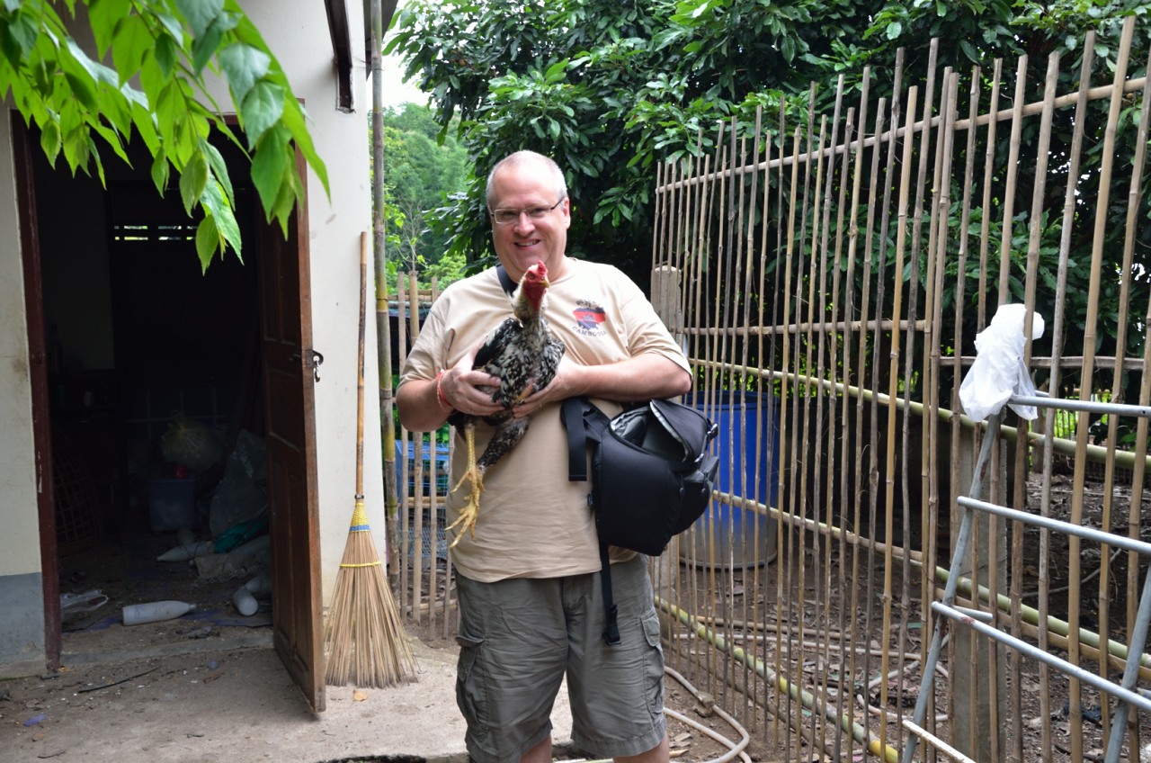 Our first stop takes us out of the city and up towards Mae Rim to see the garden. The Longan fruit is in season and there are several trees loaded with fresh fruit – it is hard to beat something fresh from the source like this and Riam gives us a bunch of clusters to take with us. The garden has changed a little bit since we were last here a couple of years ago, they are raising fighting chickens now and have a small building where they keep the birds. The adult birds are kept in bamboo cages as they need to be separated or of course they will fight with each other. They have a few prize birds that have done well in previous matches, so now they can breed those birds and sell the offspring. The sale of a couple of chickens can add up to about a month’s wages so having good birds and lots of male offspring can be quite profitable.