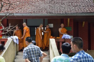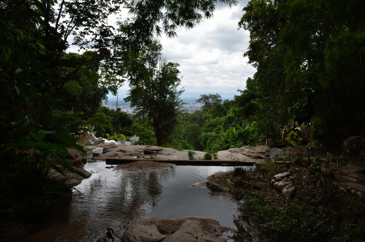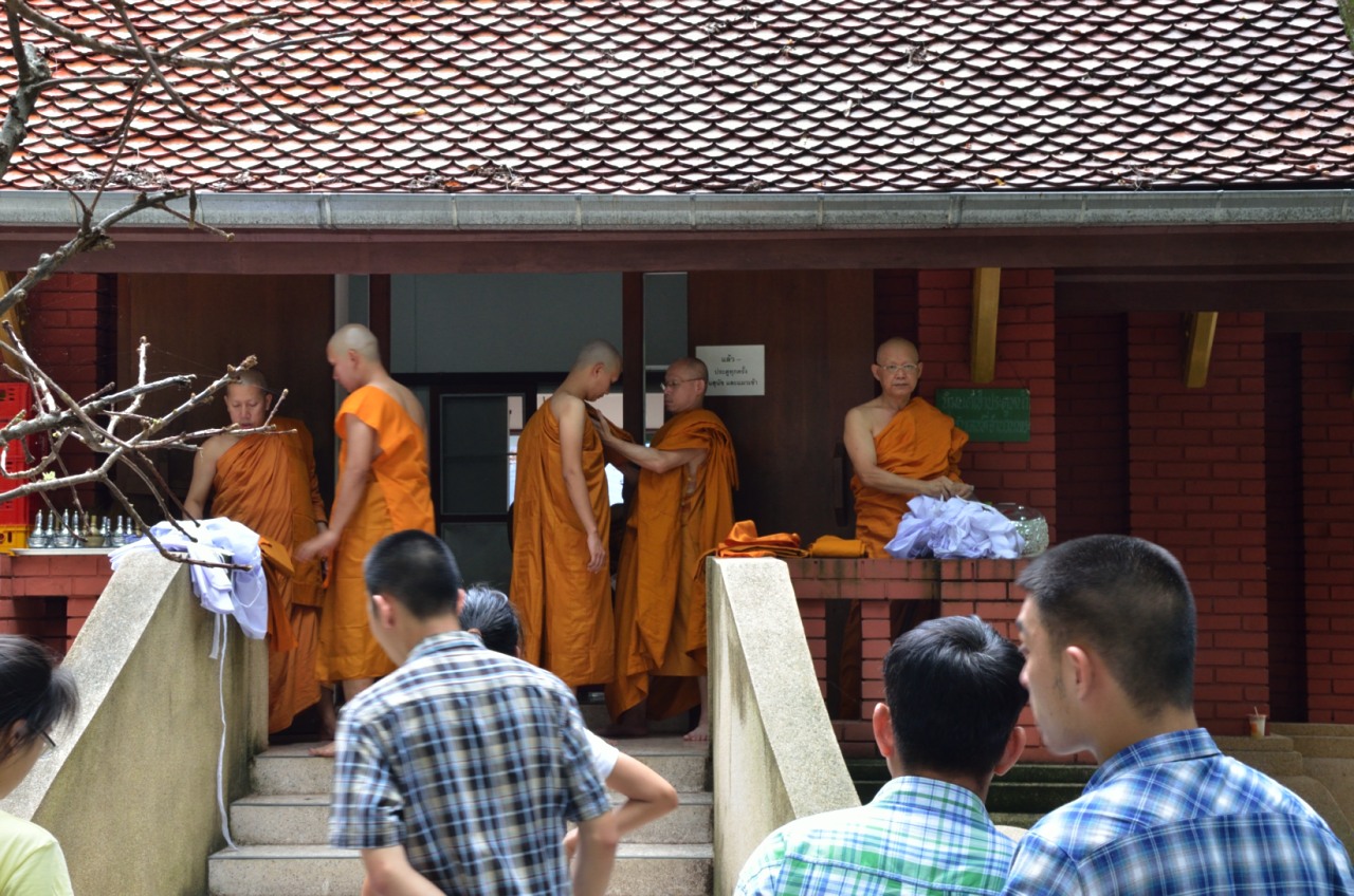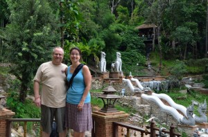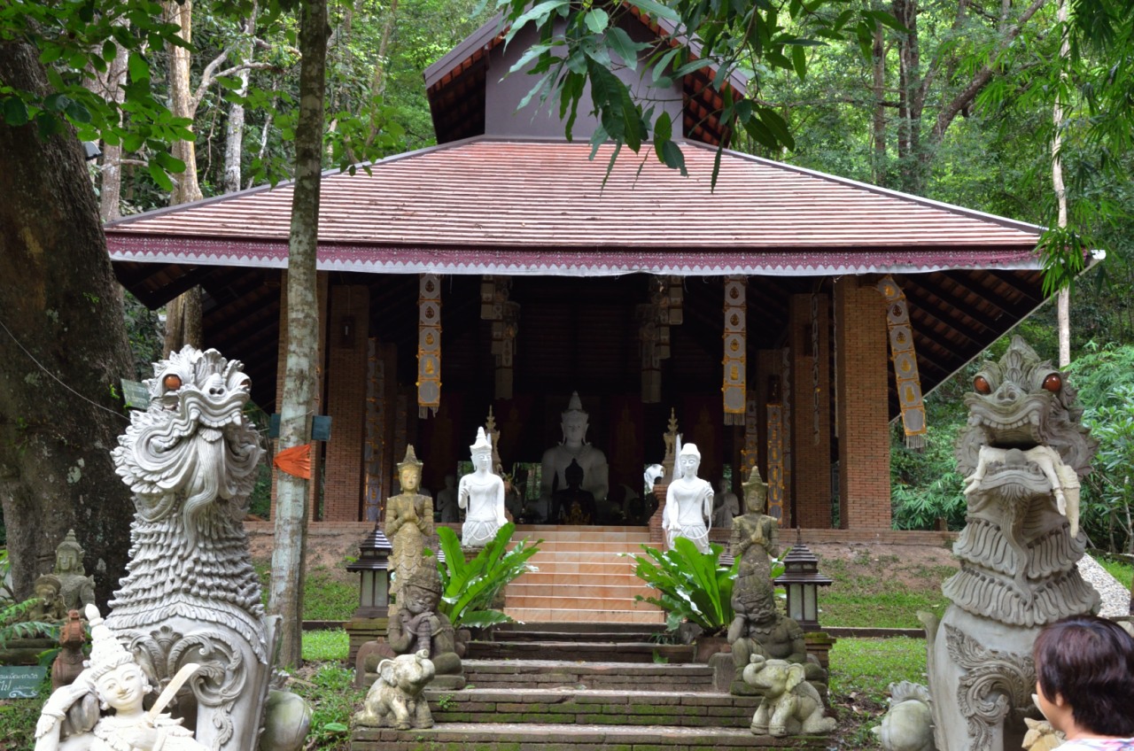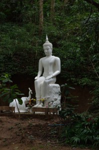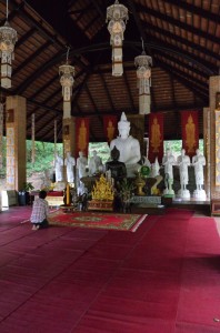 After a nice visit we say our goodbyes and load into the van for the journey back towards the city and the first of the temple stops we planned. We have been up the mountain (Doi Suthep) to see the large temple at the top (Wat Phrathat Doi Suthep) a few times, but have only really ever gone straight there and back. It turns out that there is another temple on the road up that most people are not aware of (turns out that is not a bad thing), called Wat Pa Lad. It is not well marked aside from a few signs in Thai and it is not as ‘grand’ as Wat Phrathat Doi Suthep so people either do not know it is there, or just bypass it on their way farther up the mountain. This is all good for us as the temple is mostly empty except for the monks that are meditating on the grounds so the entire place is quite and very peaceful. The grounds are beautiful and it is easy to see how buddhists that come to a place like this can find such serenity. In all her years of being a guide Riam has never been here so it is a new experience for all of us – like us she has gone by it many times but never really had a reason to stop.
