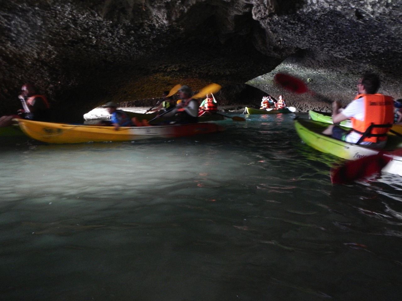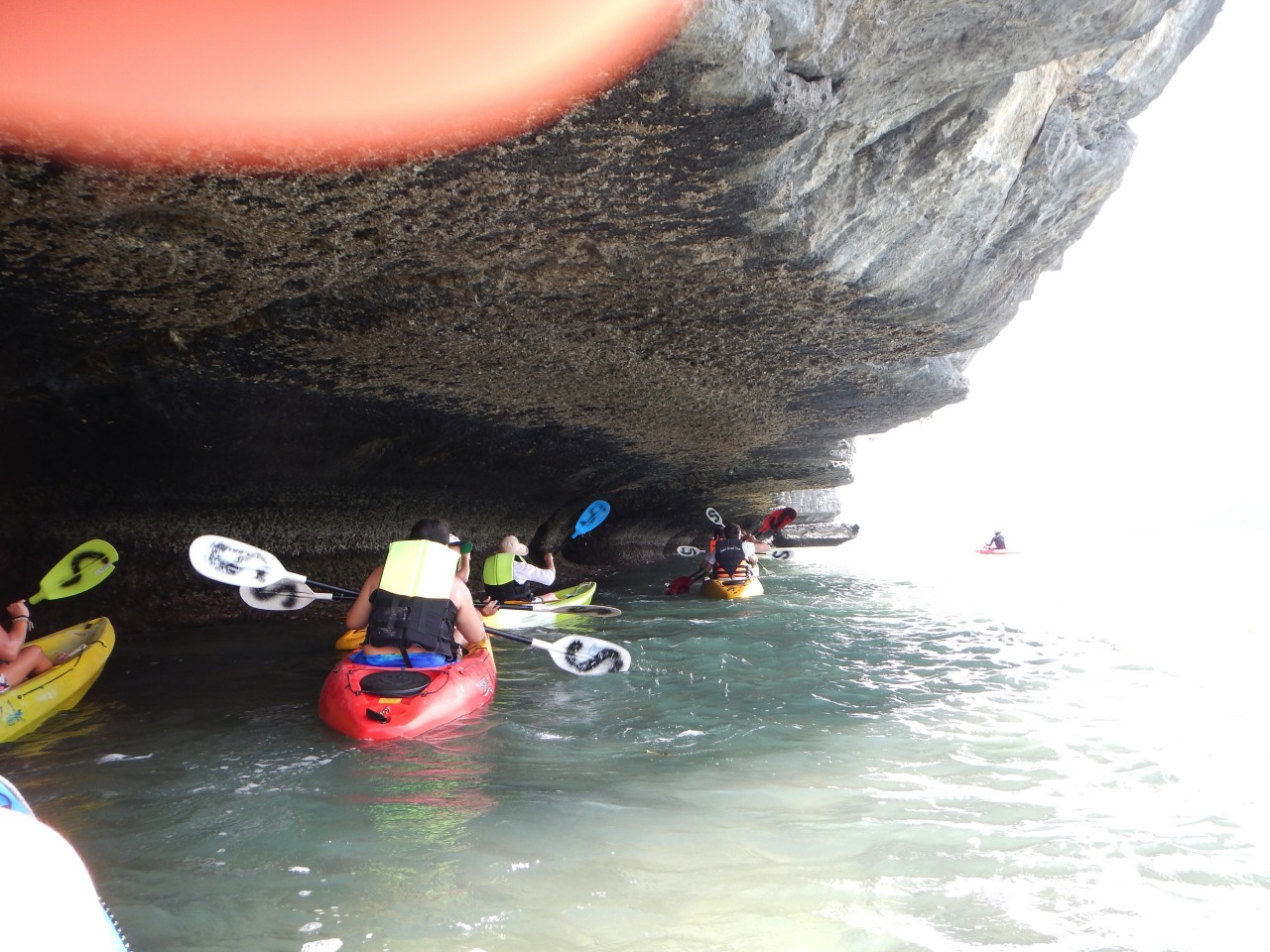 Our first stop is at Koh Mae Ko where we will do some kayaking along the coast. Erica and I get stuck with rowing duty and Mrs. Columbus appears to have turned herself into Miss Daisy for a leisurely trip along the shoreline! Erica and I quickly master the paddling though and chuckle a bit at some of the less co-ordinated boats/crews around us 🙂 The kayaking lasts about 30-40 minutes and we pass by a few isolated beaches and some stunning rock formations. The tide is out so there are places where we can actually go under the rocks where the sea has eroded away the limestone base of the cliffs above creating sort of a tunnel effect and just before our last stop there is a small cave that we can row part way into that is only accesible when the tide is out.