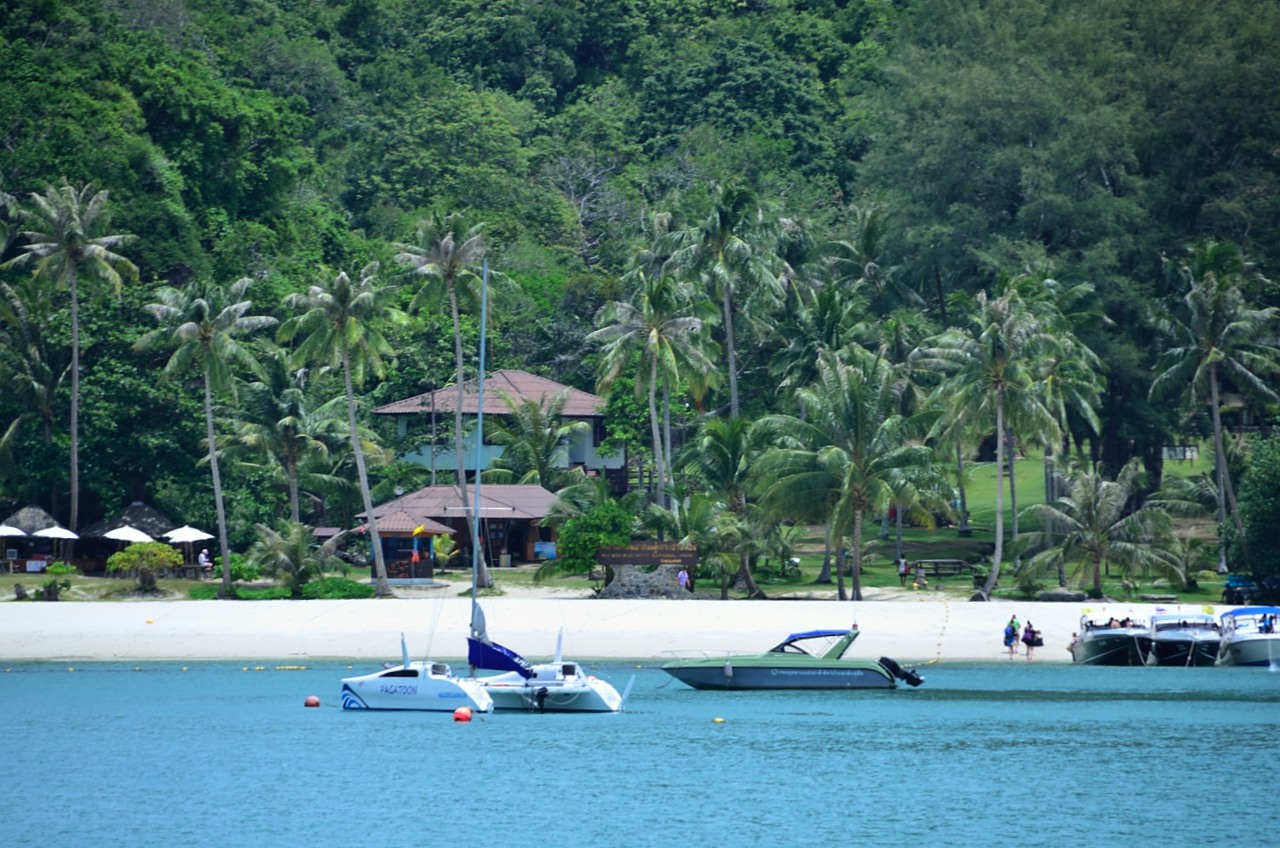 The second stop on our day trip is at Koh Wua Talap, another of the larger islands in the group, and where the park headquarters is located. The boat is going to stop here for a couple of hours and we are given a number of choices on how to spend the time. We can swim at the beach, do more kayaking, just relax either on the island or the boat, or there are a couple of hikes we can do on the island. There is a cave on this island that contains stalagmites and stalactites that seems interesting, but the one that catches our interest is the hike up to one of the limestone peaks that offers a rewarding view of most of the marine park.