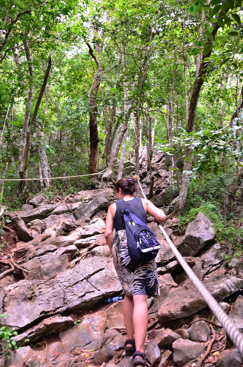 There are a few viewpoints along the way that each offer their own impressive view of the bay below and the island clusters, and also a much need point to stop for a breather and hopefully some shade from the hot sun. At about 2/3 of the way to the top a couple of the guides from the boat come scrambling along barely breaking a sweat and one of them is even in bare feet! I am sweating enough that I look like I have just stepped out of the shower and I think to myself that perhaps it would feel better if I was to swing my what now feels like 1500lb bag at one of them! Before I reach the top, the guides have reached the summit, collected a bunch of empty water bottles that have been left behind by tourists and are making their way back down – so now barefoot, and hands full they are still making it look like a walk in the park – I guess that is the benefit of doing this every day vs once a year. It is nice however to see that they really care about keeping the park pristine and natural – it is sad to see that many of the tourists think of places like this as just a spot to have a look around and dump their garbage for someone else to worry about.