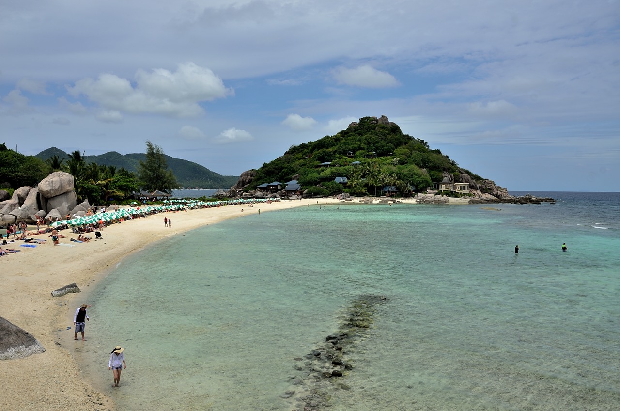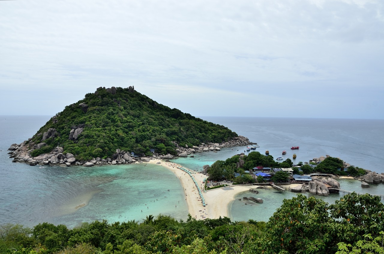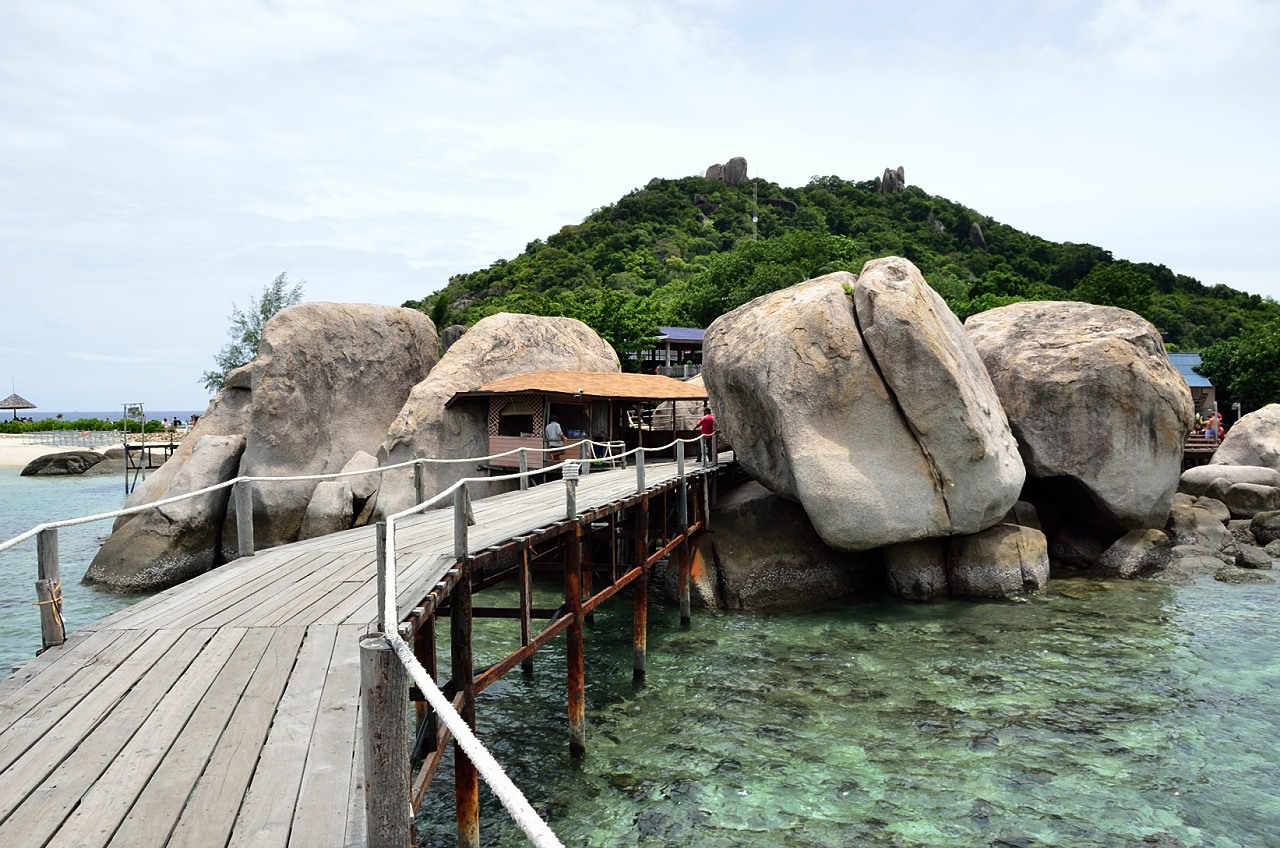 The island is basically 2 large limestone ‘islands’ that rise up a few hundred meters connected in the middle by a sandbar. There are some bungalows on each of the islands so you must be able to rent them and stay overnight if you are so inclined. There is also a restaurant and a dive shop here to service the day trippers from Koh Tao and the people going to the dive site that is located just off the island.
