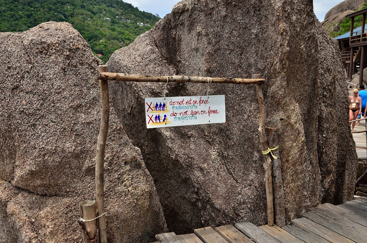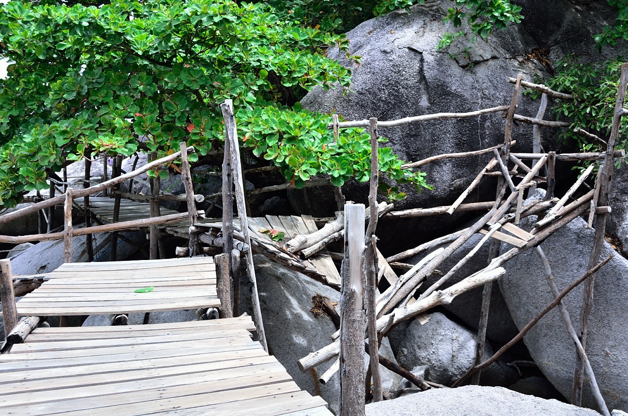 There appears to be a wooden walkway that circles each of the islands, so Mrs. Columbus and I head off to do some exploring. In typical Thai fashion, many things are not built to the same set of standards that we would see back home, but that does not slow us down and we head off down the rickety walk around the larger island. What does slow us down however is when enough sections of the trail have been washed out by the sea and the trail ends abruptly. We try going the other direction in hopes that it is just a few sections that are out, but we meet with the same results.