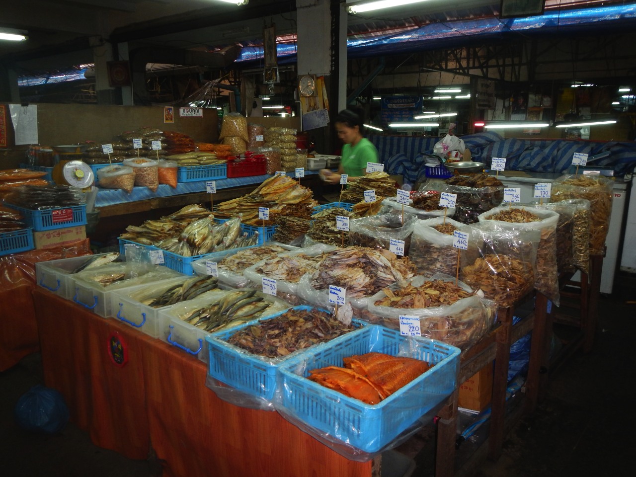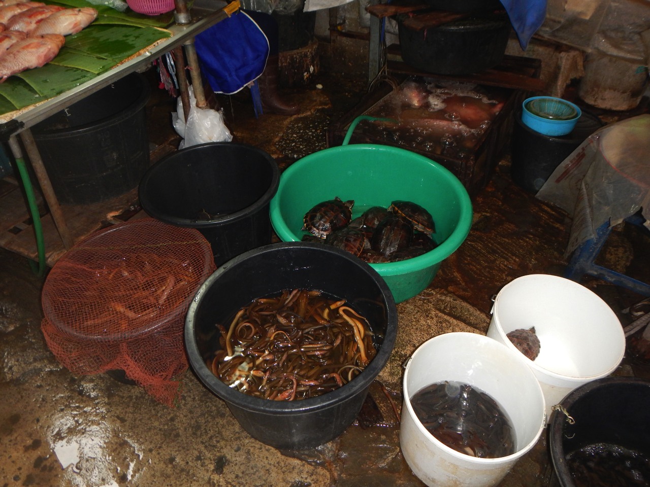 This is a market where the locals shop, so in addition to clothes and household goods like pots and pans, one can find raw meat, salted fish, and of course the oh-so-important occasional bucket of frogs or turtles.