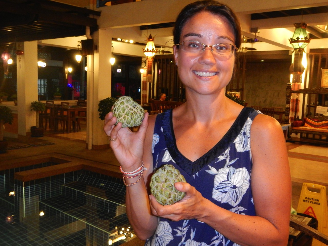 Back to see Tee and Ian for dinner at Ginny Cafe where Tee continues to spoil us with good food and treats! The other day we asked her in passing about a fruit called Noi Na (Thai Custard Apple – they looks sort of like green hand-grenades) that was mentioned to us by Frank and Oy (our Thai teacher back home), and today when we show up she has a few of them that she picked up at the market for us to try 🙂 I keep warning Tee that if she keeps spoiling us this way that I may just move in permanently!