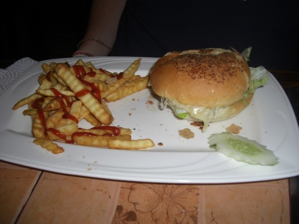 In the interest of being able to provide feedback on the full extent of their menu I have decided to try the cheeseburger for dinner tonight. Lots of people come by here for their burgers and they are well reviewed so I think it is only right that I form my own opinion. Mrs. Columbus feels like this is a violation of her rule of only having Thai food in Thailand, but I counter that it is being made from scratch by Thai people, so it qualifies as Thai in my book. Her rules do seem to have some sort of flexibility as I see that she is not all that quick to turn down the chance for a banana split for dessert – her rationale being that the bananas are from Thailand…..