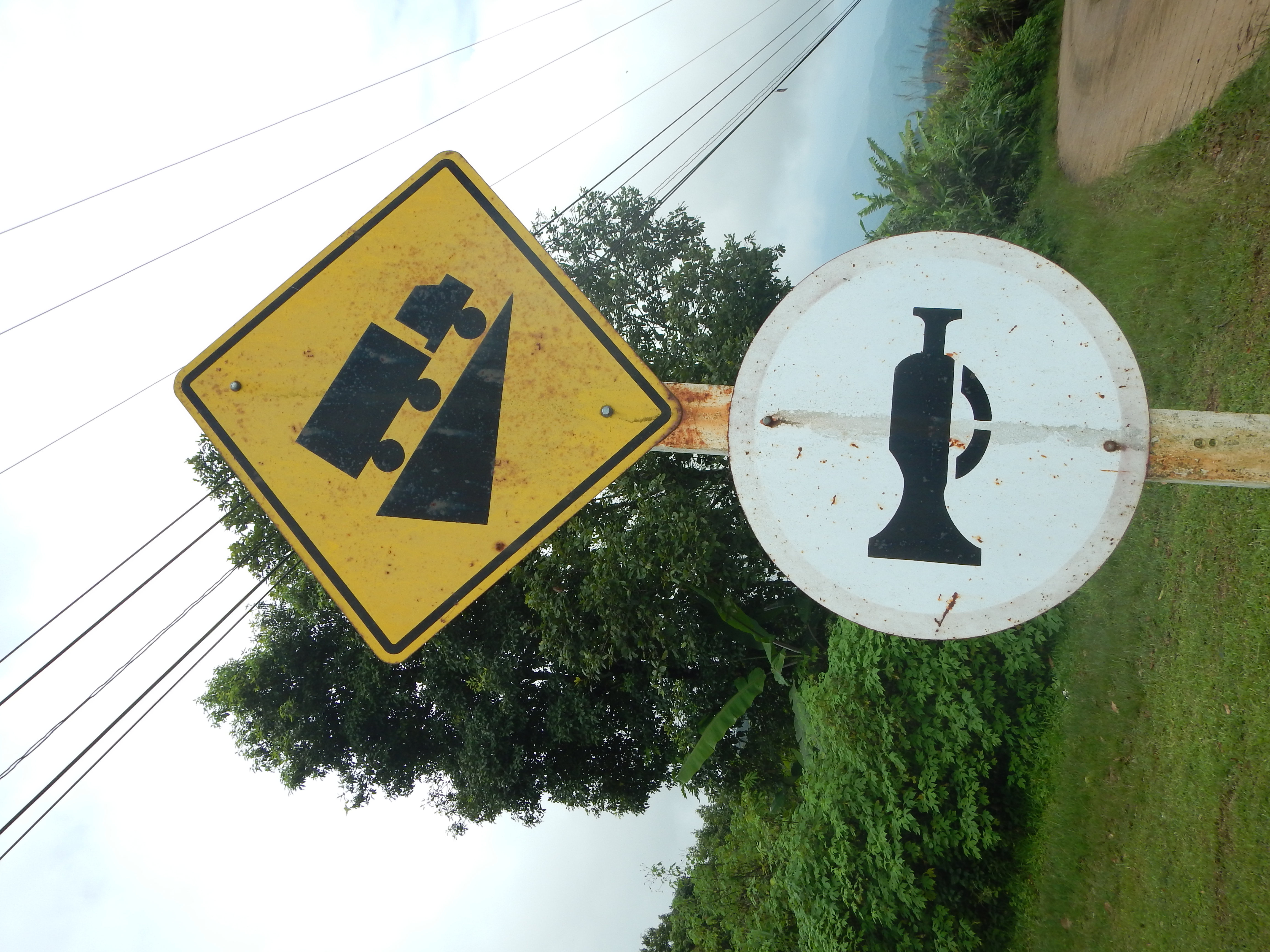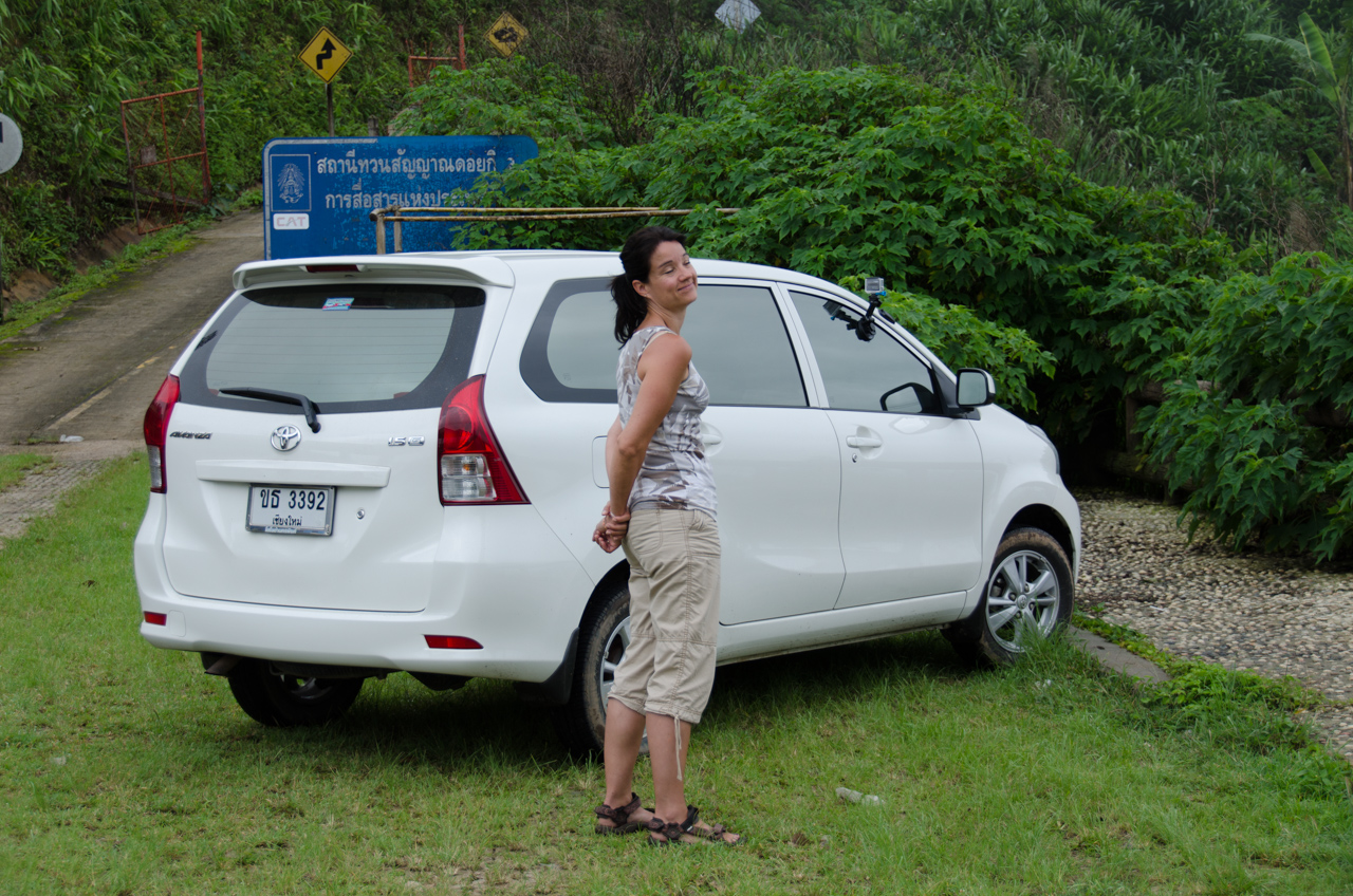 20140703-220926One of the stops is marked on the map as a viewpoint and a microwave station, but the maps says ‘steep road’ so I am immediately drawn in. The road starts off fairly good, nice hardtop and not too steep, so I am feeling bold, but it quickly evolves to something narrower and quite a bit more steep!  Thankfully our trusty tin-can is powered by 2 gophers (vs just the one in Mrs. Columbus’ car back home) and the slope is no problem. A little more of a problem is the sharp, blind corners and the occasional oncoming truck or motorbike, and we often have to squeeze off the basically single lane road to both sides to pass one another. The Thai department of transportation has carefully marked all that on about 10% of the corners! 😉