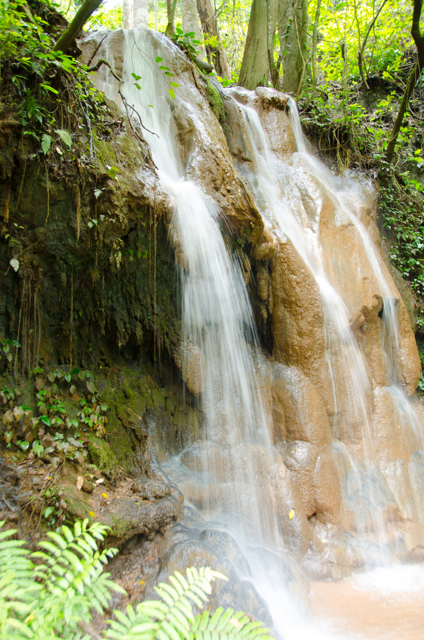 The road is a little more questionable than the road we took yesterday, but all along the way we see signs still indicating that we are on the right way to the waterfall so we press on. Finally after passing through another village, and past lots of rice and vegetable fields, we come to the end of the passable road and we stop the car. Again there is another sign pointing to the waterfall, so we decide that we are far enough in that we should keep going on foot. I am prepared for a walk of a few kilometers through the rice fields, but we are pleasantly surprised when we round a bend in the path a few hundred meters in and see a sign announcing the park / waterfall.