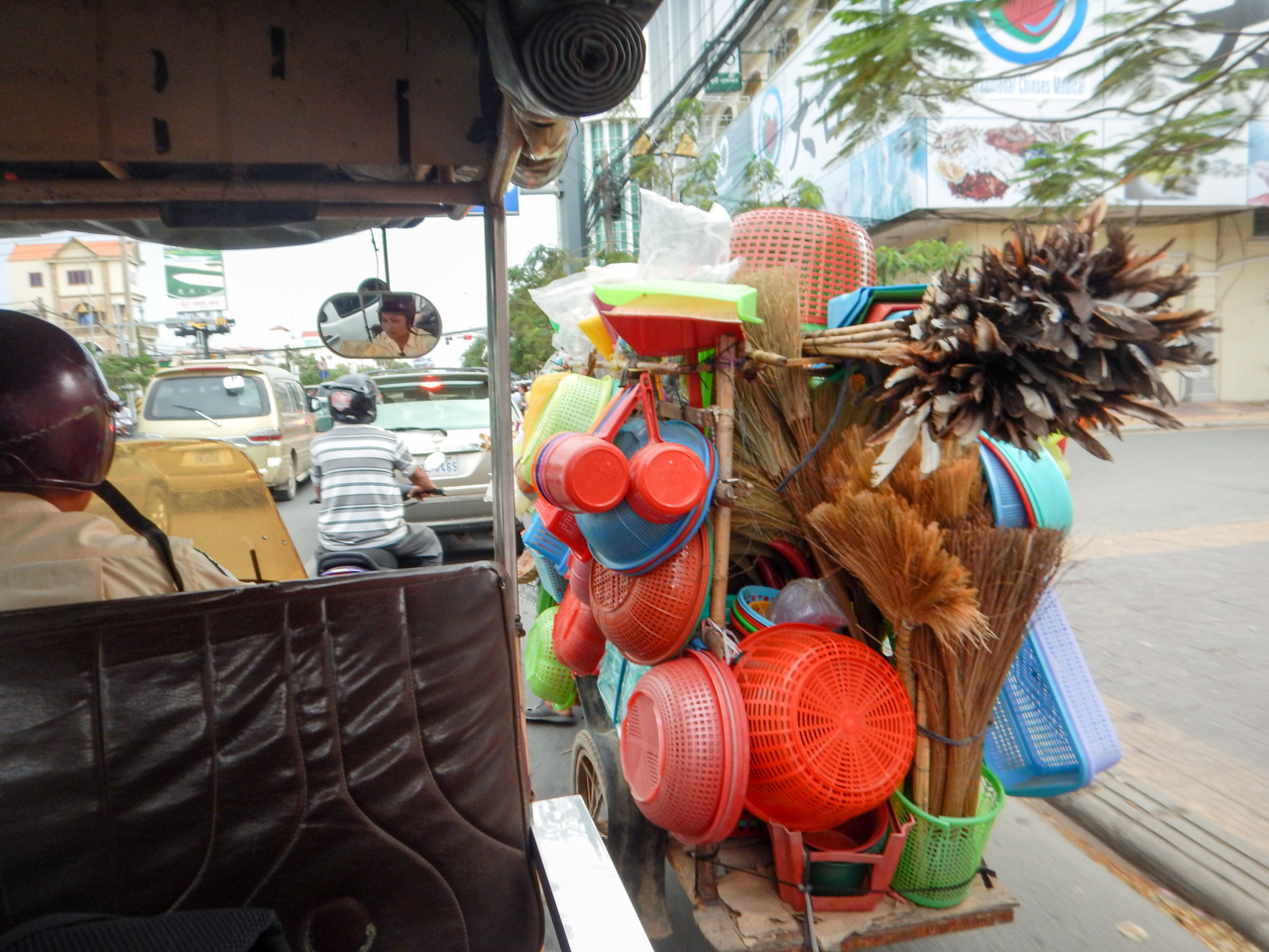 Phnom Penh is the capital city of Cambodia with a population of about 2 million people. The city has a lot of French influence with nice wide streets and a lot of colonial style buildings, but as with many SE Asian cities it is VERY busy! Our trip from the airport in a tuk-tuk is very entertaining as our driver weaves in an out of traffic – often facing motorbikes that are traveling the wrong direction on our side of the street, and some of the most congested traffic I have seen. It is a good thing that the streets are so wide, because some of the maneuvers that we see on the streets here would not at all be possible in the more tightly packed streets of Thai cities.