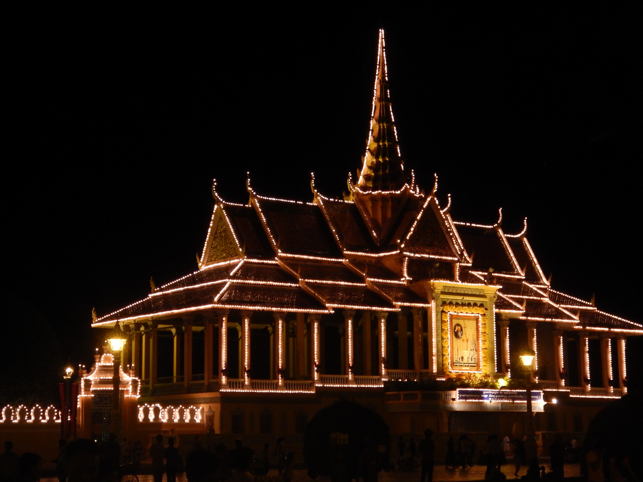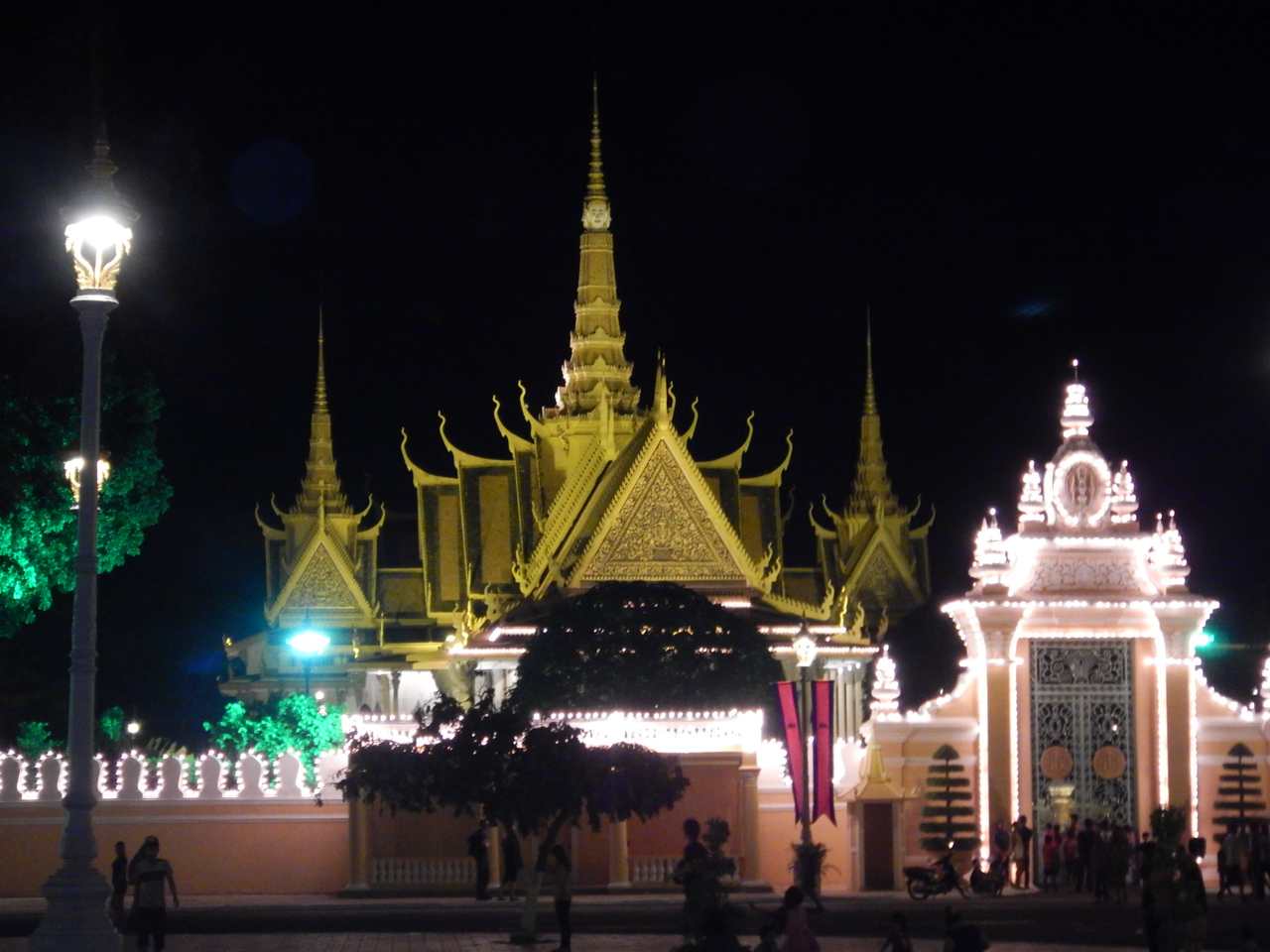 Our hotel is located not far from the bank of the Mekong river, and after getting settled in we walk out for a look around and to find some dinner. The riverbank has a nice wide sidewalk (unlike the mostly non-existent sidewalks in Thailand) and after dinner we walk along for quite a distance taking in the scenery. It is a national holiday here to celebrate on of the previous kings – King Sihanouk – so part way through our walk we are rewarded with a nice fireworks display from across the river. Along the riverside we pass by the Royal Palace that is all lit up for the evening, and because of the holiday a few of the streets are closed to traffic and there are lots of people wandering about.